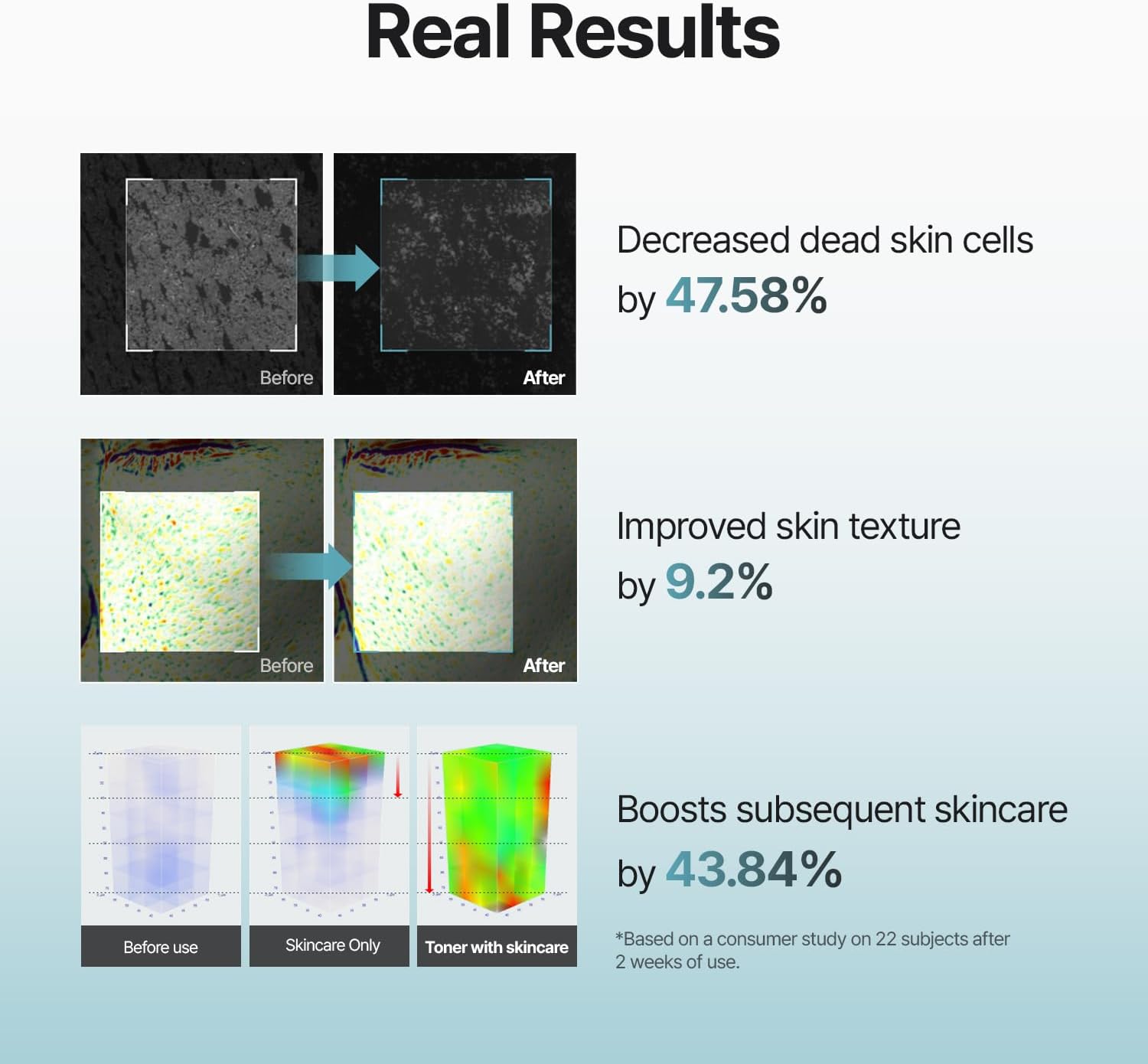 Чрез ефективното премахване на мъртвите клетки, тоникът позволява на серумите, кремовете и грима да проникват и да прилепват правилно, което води до по-равномерен и ефективен завършек.